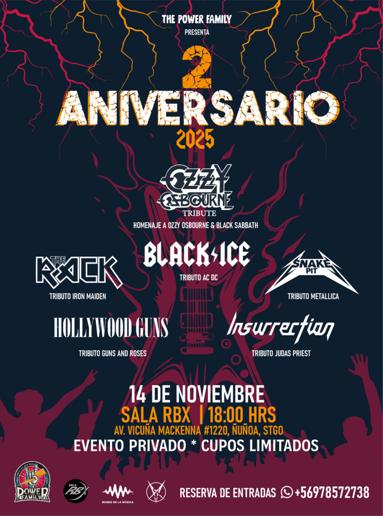 Y para seguir fortaleciendo esa genuina unión rockera, ahora están organizando su segundo aniversario con un gran evento en la Sala RBX de Santiago, que contará con bandas en vivo tributando a los íconos de la escena mundial del metal. Te dejamos acá con el afiche oficial de esta gran tocata del próximo 14 de noviembre, que marcará un nuevo reencuentro de The Power Family, una agrupación que seguramente seguirá llevando la bandera chilena por los principales recitales y festivales rockeros del mundo.