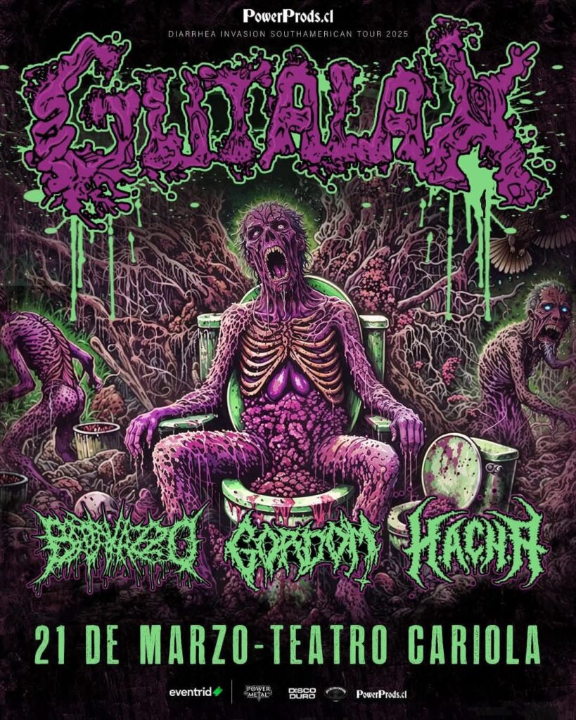 Pero Gutalax no estarán solos, ya que habrá invitados nacionales de lujo para esa jornada en Santiago Centro: Batakazzo, Gordom y Hacha. La bestialidad y «fecalidad» ya están más que garantizadas entonces. No te quedes fuera de este evento imperdible y adquiere tu entrada a través del sistema Eventrid. Te dejamos con el afiche oficial del debut de Gutalax en Chile.