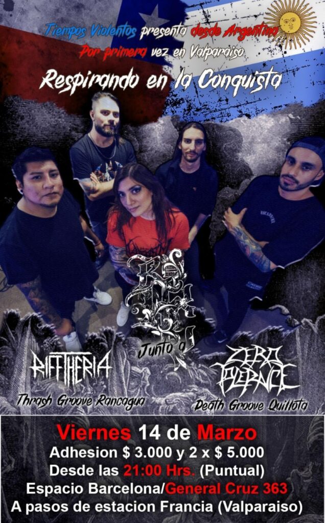 Una de las agrupaciones más destacadas de la escena de Argentina, Respirando en la Conquista, estará de vuelta en Chile en el mes de marzo. La banda cultora del estilo death metal, deathcore y djent, tocará el viernes 14 de marzo en la Sala Barcelona de Valparaíso. En tanto al día siguiente, sábado 15 de marzo, estarán en El Vagón de La Calera. Los dejamos con los afiches de ambos shows en la V Región, junto a destacadas bandas invitadas.