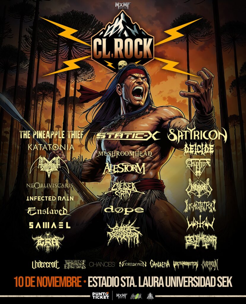 Cada vez falta menos para lo que será un momento histórico de la música extrema en Chile. Nos referimos al anunciado megafestival CL Rock, programado para el 10 de noviembre en el Estadio Santa Laura-Universidad SEK de Santiago de Chile. Incluso a toda la lista de artistas ya convocados, hace poco se sumó a tres nuevos grupos internacionales que engrosan el impresionante line up de bandas. Los convocados son Mushroomhead (Estados Unidos, Nu Metal e Industrial), Dope (Estados Unidos, Nu Metal) y Ne Obliviscaris (Australia, progresivo). Por todo lo anterior, hazte parte del histórico inicio de esta nueva era en los megafestivales, comprando tu entrada a través de Puntoticket. Te dejamos con el afiche de este magno evento.