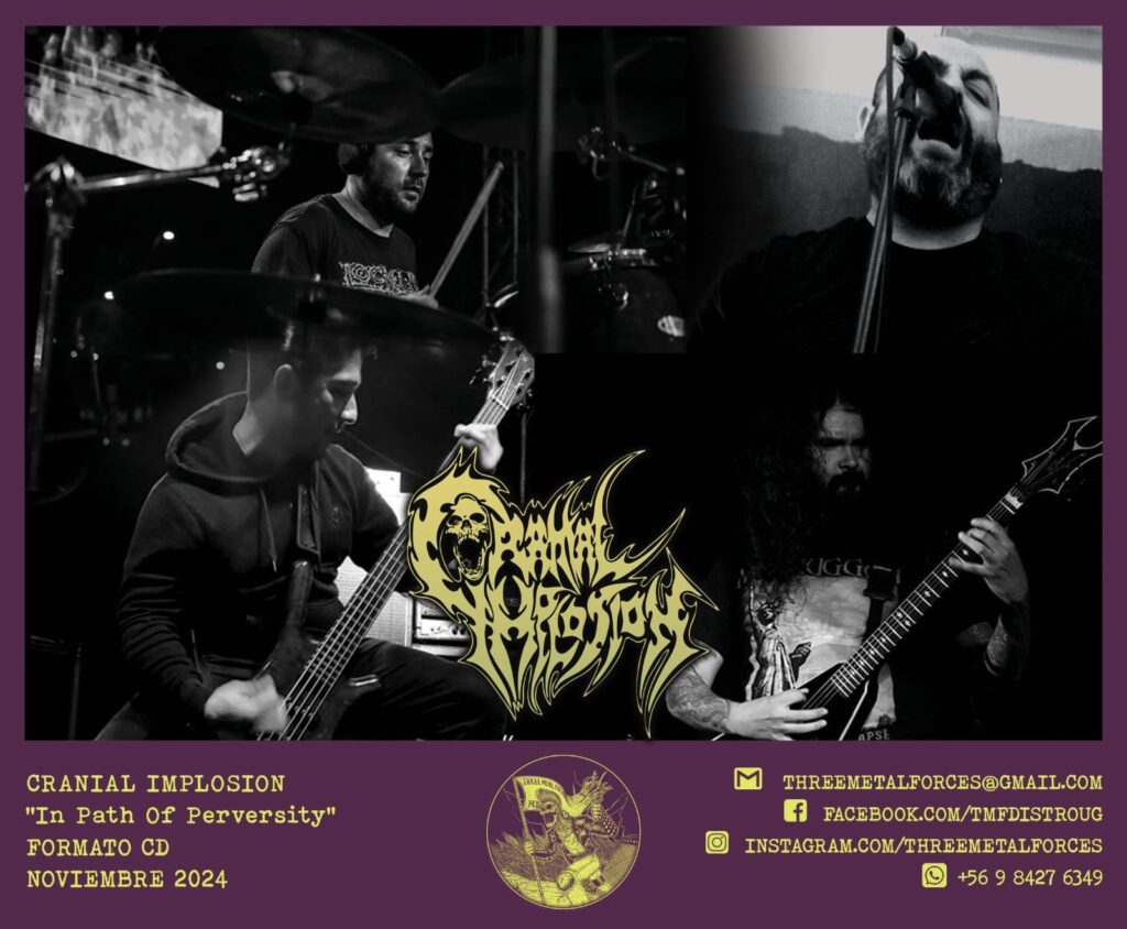 La banda chilena de brutal death metal Cranial Implosion, formada el año 2005 en Antofagasta, lanzó recientemente su último trabajo, el segundo LP de su carrera, que lleva por nombre «In Path Of Perversity». El álbum salió al mercado en noviembre de 2024, bajo el sello discográfico Three Metal Forces. Contiene un total de 7 bestiales temas. La banda ya había publicado anteriormente dos demos y el disco «Lost On Dead Dominions» en el 2015.