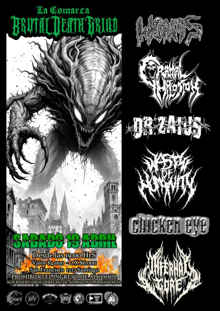 Pero eso no es todo, ya que el próximo sábado 19 de abril los nortinos Cranial Implosion serán parte de la bestial jornada Brutal Death Grind, que se llevará a cabo en La Comarca, Santiago. Este es el flyer de esa tocata.