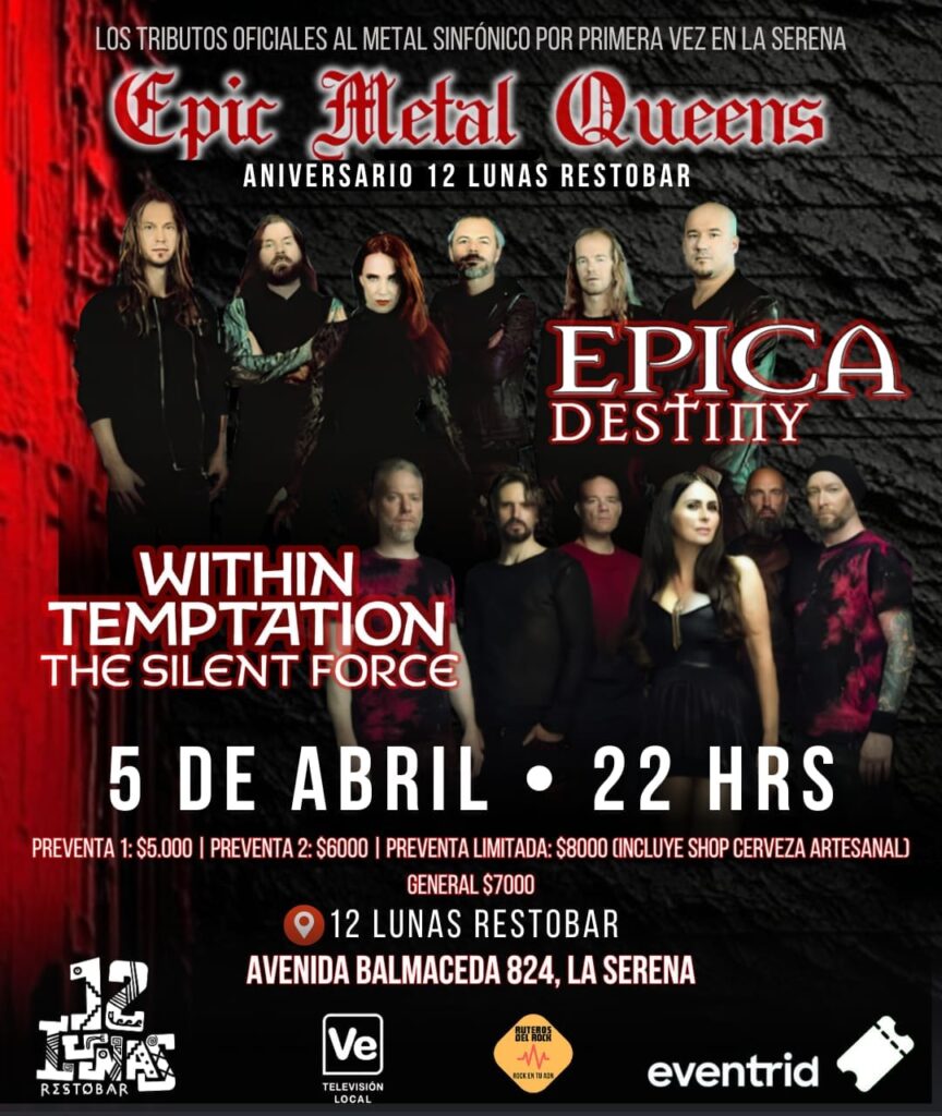 «¡Amigos de La Serena!! Los dejo cordialmente invitados a este hermoso evento del “Epic Metal Queens”, que con mucho esfuerzo gracias a Restobar 12 Lunas y Ruteros del Rock estamos llevando a su región, ambas bandas estamos preparando un show muy bonito, de larga duración y con los mejores temas de cada banda, de verdad no se lo pueden perder, es una oportunidad única para poder ir a escuchar en vivo a los tributos del metal sinfónico y sus temas favoritos de cada banda, ya van varias entradas vendidas así que aseguren la suya si están pensando en ir y no se queden fuera.