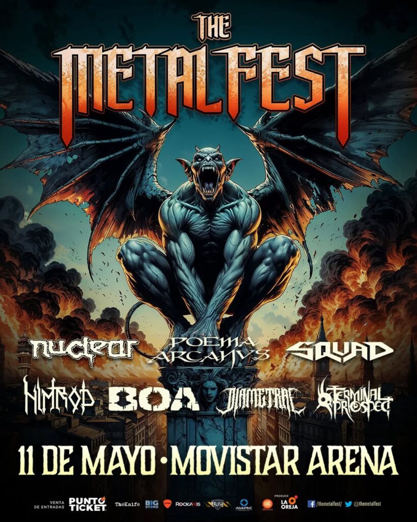 Y las bandas chilenas invitadas para esta ocasión son: Nuclear, Poema Arcanvs, Squad, Nimrod, Boa, Diametral y Terminal Prospect. Sin duda un anuncio de lujo, que da realce al trabajo musical que desarrolla nuestra escena nacional de música extrema. Por lo mismo, no te quedes fuera del The Metal Fest y adquiere tu entrada por sistema PuntoTicket. Te dejamos con los afiches con la reseña de cada una de las 7 bandas chilenas que se lucirán este año en el Movistar Arena de Santiago.