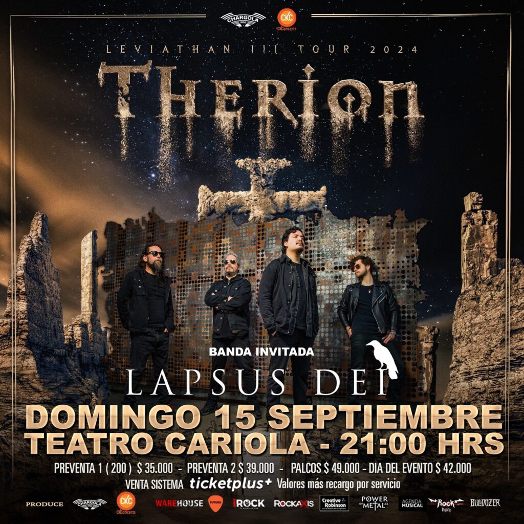 Por fin está llegando la fecha que tanto esperaban los fanáticos de Therion. Porque este domingo 15 de septiembre, en el mítico Teatro Cariola de Santiago de Chile, se concretará el regreso de los padres del metal sinfónico: Therion de Suecia. La agrupación tocará temas de su más reciente trabajo “Leviathan III”, junto con los grandes clásicos de sus discos emblemáticos como “Theli”, “Vovin” y “Lemuria”. Y como banda chilena invitada para este domingo estará Lapsus Dei, quienes desde 1998 se han destacado con su excelente propuesta de death metal melódico con doom. Aún quedan entradas disponibles a través de Ticketplus. No te pierdas esta jornada inolvidable que nos trae Chargola Producciones.