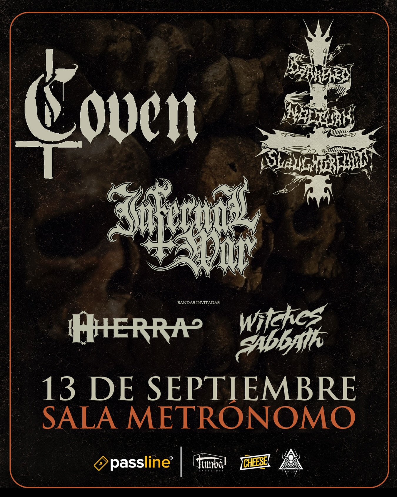 La oscuridad se tomará Santiago de Chile el próximo sábado 13 de septiembre, con el esperado regreso de la legendaria banda Coven, de Estados Unidos (en la foto). Pero no estarán solos, ya que también será el debut de las agrupaciones Darkened Nocturn Slaughtercult (Alemania) e Infernal War (Polonia). Ademas, dos entidades nacionales con presencia femenina abrirán la jornada: Witches Sabbath y Hierra.