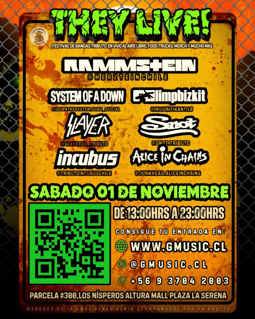 Un panorama imperdible se avecina para el próximo feriado largo en La Serena, concretamente el sábado 1 de noviembre. Se trata del evento familiar They Live!, organizado por la productora Global Music, que se llevará a cabo desde las 13:00 horas en la Parcela 388 de Los Nísperos, a la altura del Mall Plaza La Serena. La jornada se prolongará hasta las 23:00 horas, con los mejores tributos chilenos a bandas internacionales, al aire libre y en un grato ambiente rockero. Te dejamos con el afiche oficial del evento y no te quedes fuera de esta fiesta del metal, adquiriendo tu entrada en www.gmusic.cl.
