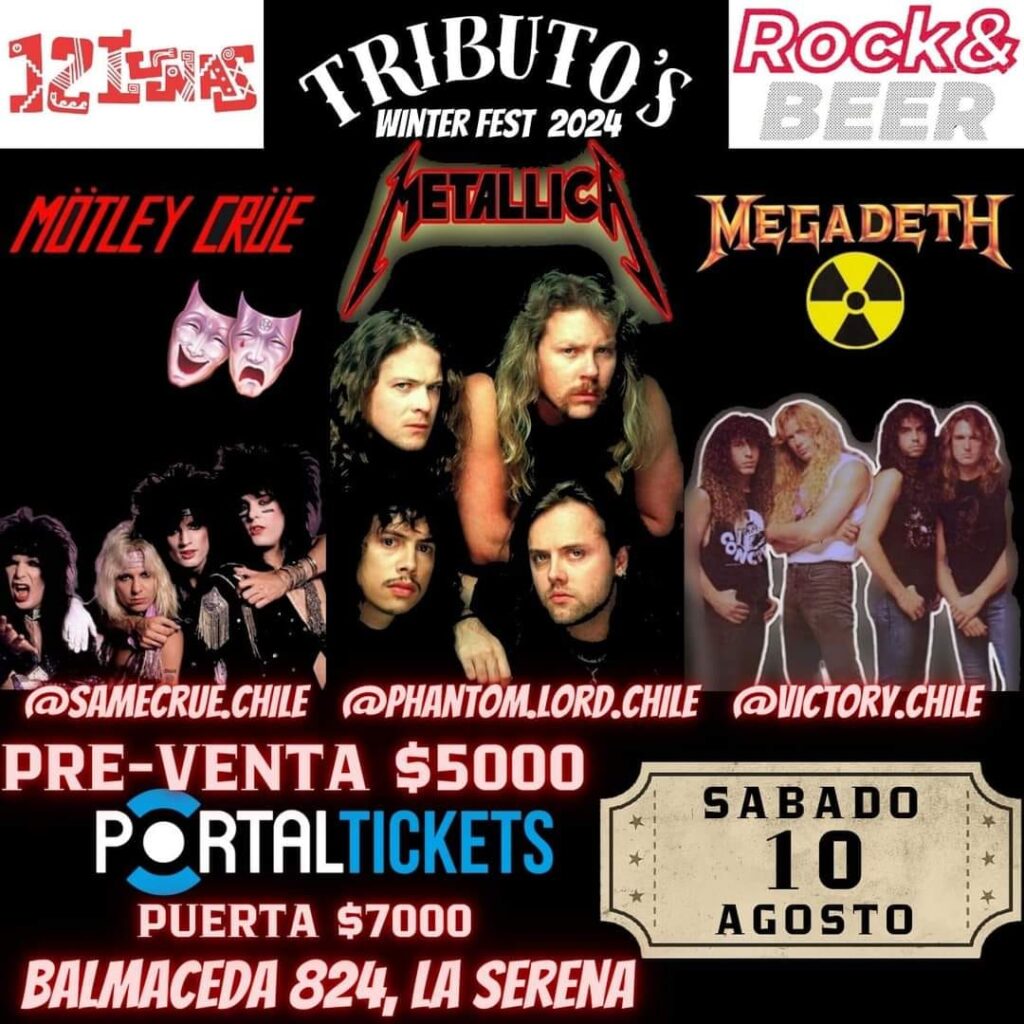 Este sábado 10 de agosto, en el Restobar 12 Lunas del centro de La Serena, se presentarán las bandas Same Crue (tributo a Mötley Crüe), Phantom Lord (Metallica) y Victory (Megadeth). El evento parte a las 20:30 horas y lleva por nombre Winter Fest 2024. Adquiere tus entradas por sistema Portaltickets.