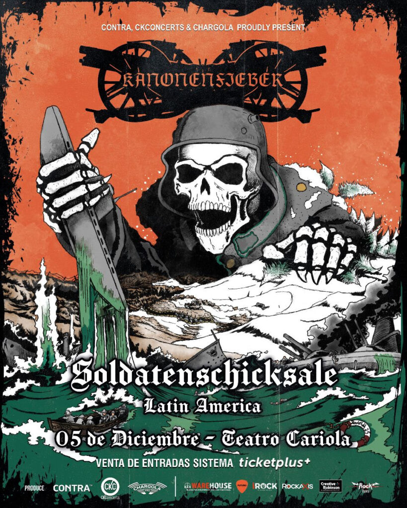 Una verdadera guerra sonora se vaticina en Chile para el próximo 5 de diciembre, con la primera visita a Santiago de Kanonenfieber de Alemania, cultores del estilo blackened death metal. Y nuevamente será el Teatro Cariola el que albergará este show único en Chile, que se enmarca dentro de una gira latinoamericana que además incluye a México, Argentina, Brasil, Costa Rica y Colombia. Te dejamos con el afiche de la fecha en Santiago.
