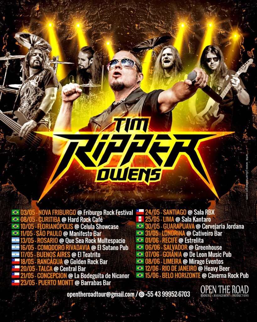 Uno de los artistas más relevantes del heavy metal mundial, el ex Judas Priest Tim Ripper Owens, está realizando una extensa gira latinoamericana que tendrá varias fechas en Chile, siendo el 24 de mayo la cita elegida para la capital, Santiago. Acá puedes mirar el afiche del tour completo, que ya partió el 3 de mayo en Brasil.