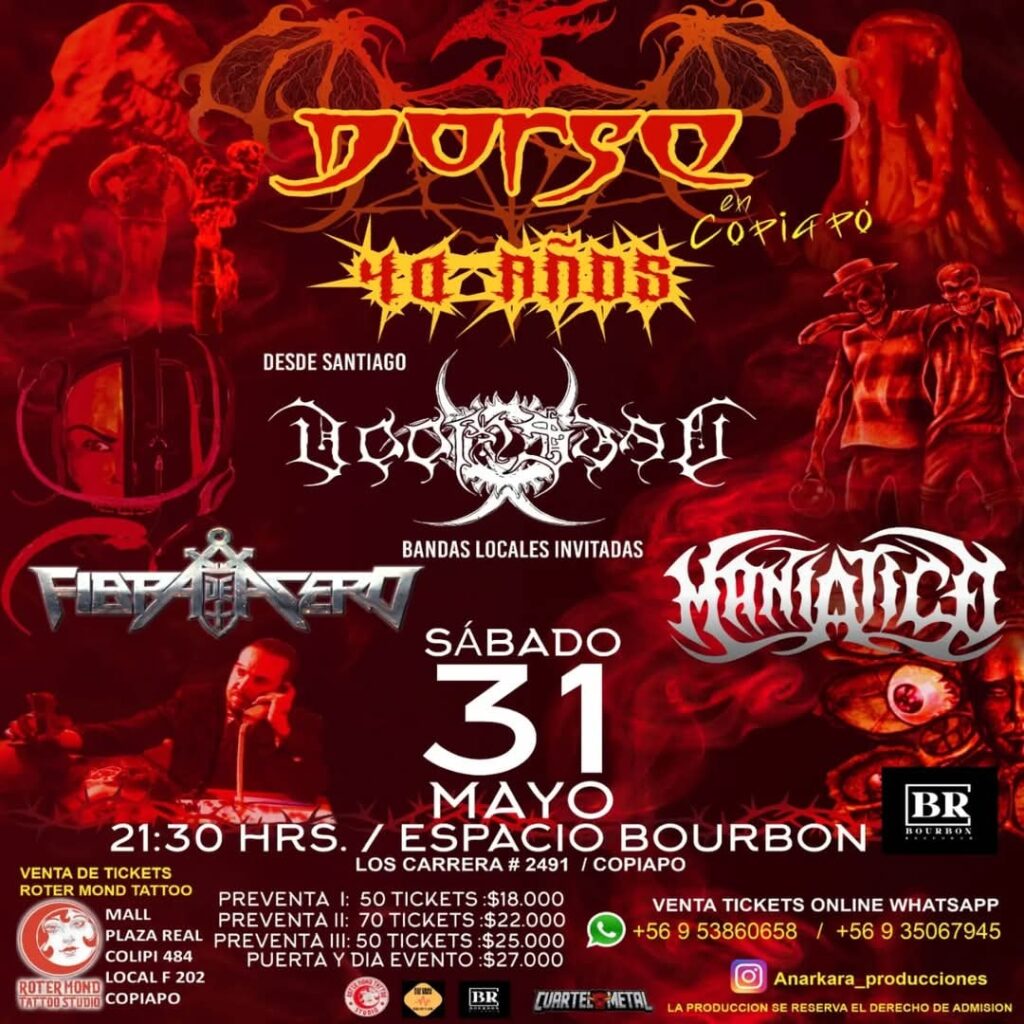 En el marco de la celebración de sus 40 años de carrera, la icónica banda chilena Dorso tocará en Copiapó el próximo sábado 31 de mayo, en el Espacio Bourbon. Compartirán escenario con las destacadas agrupaciones Doomsday, Fibra de Acero y Maniático. No te quedes fuera y adquiere tus entradas a través de las indicaciones que aparecen en el afiche oficial.