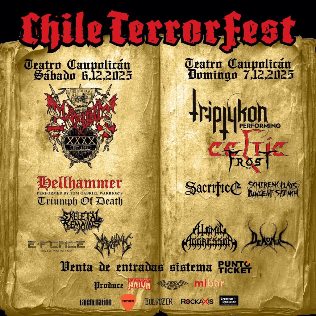 De esta manera, dl sábado 6 de diciembre se presentarán Mayhem, Triumph of Death (evocando a Hellhammer), Skeletal Remains, E-Force y Mayhemic. Y el domingo 7 estarán Triptykon (evocando a Celtic Frost), Sacrifice, Schirenc Plays Pungent Stench, Atomic Aggressor y Demoniac. Dos jornadas imperdibles en Santiago de Chile.