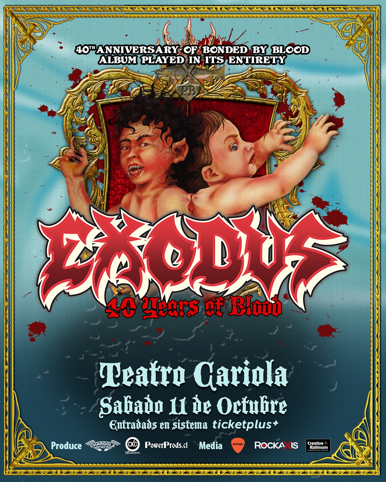 Una de las bandas más importantes de la historia del thrash metal, Exodus de Estados Unidos, vuelven con todo a Chile el próximo sábado 11 de octubre, en el marco de la celebración del aniversario de «Bonded By Blood». La placa cumple 40 años y es todo un clásico dentro de la música extrema. Te dejamos acá con el afiche oficial de este magno evento en el mítico Teatro Cariola de Santiago, recinto acostumbrado a recibir a las grandes bandas del metal.