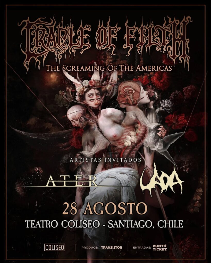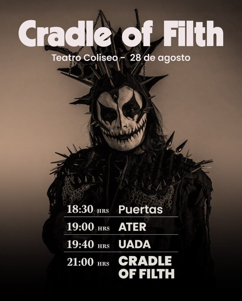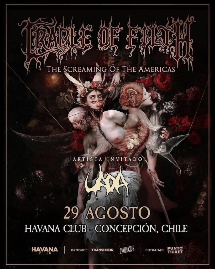 Días turbulentos ha vivido la banda británica Cradle Of Filth, con dos sensibles bajas por peleas internas, justo en medio de su gira latinoamericana. Pero los fans en Chile no tienen que preocuparse, porque se cumplirán las dos fechas pactadas para esta semana, tanto en Santiago como en Concepción. Aquí te dejamos los datos en los afiches correspondientes. La banda liderada por Dani Filth sigue adelante con todo y contra todos. Y piensa demostrarlo en esta nueva visita a nuestro país, en que los acompaña también Uada.