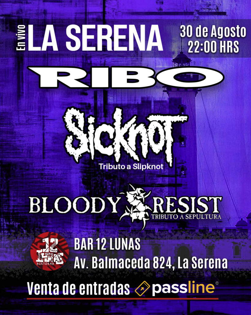 Desde Viña del Mar llegará toda la potencia rockera de la banda Ribo, el sábado 30 de agosto al Restobar 12 Lunas de La Serena. La destacada agrupación nacional compartirá escenario con Sicknot, banda tributo a Slipknot, además de Bloody Resist, que toca los éxitos de Sepultura. Te dejamos con el afiche oficial de este evento en 12 Lunas, auspiciador de nuestro programa Ruteros del Rock en la televisión.
