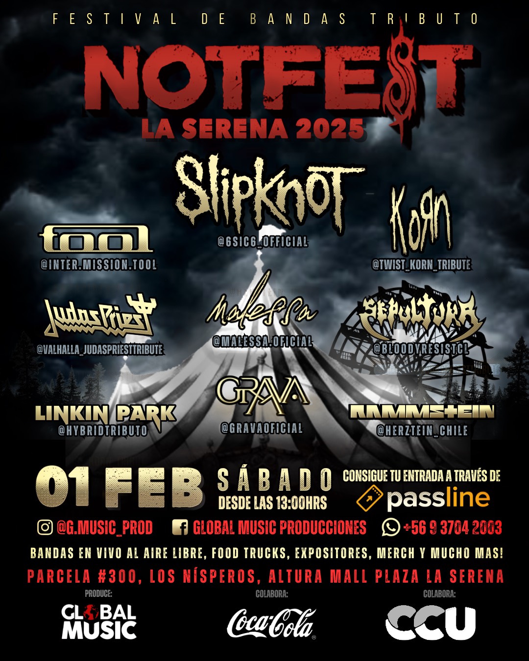 Un gran evento familiar en torno al rock y el metal se vivirá el próximo sábado, con la realización del Notfest La Serena 2025. La jornada, que partirá a las 13:00 horas, será en la Parcela número 300, Los Nísperos, a la altura del Mall Plaza, con la presencia de las mejores bandas tributo de Chile y también destacadas agrupaciones con temas propios. Las entradas están disponibles a través del sistema Passline. Igual se pueden adquirir en el Restaurant Terraza y en la tienda Hellrecords del centro de La Serena. Produce Global Music.