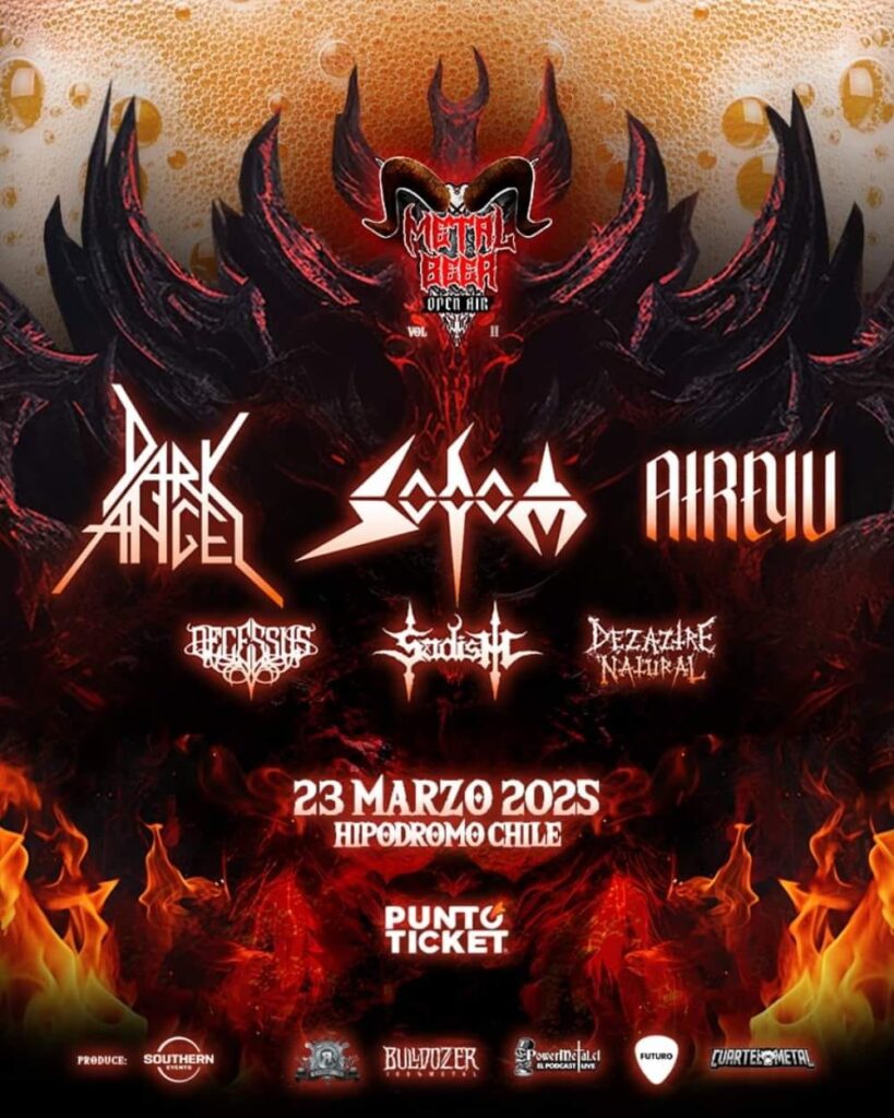Las agrupaciones convocadas para esta ocasión son las internacionales Sodom (Alemania), Dark Angel (Estados Unidos) y Atreyu (Estados Unidos), junto a las bandas chilenas Sadism, Decessus y Dezaztre Natural. Ya lo sabes y no tienes excusas para quedar fuera de esta fiesta del metal, donde podrás disfrutar de la mejor música bebiendo una exquisita cerveza.